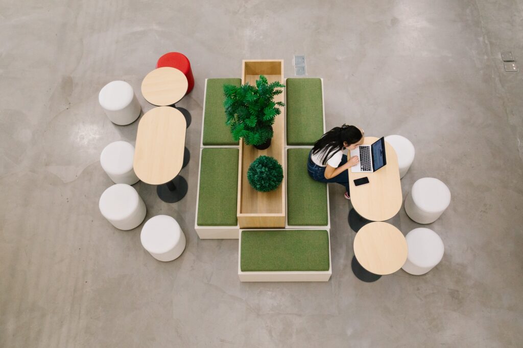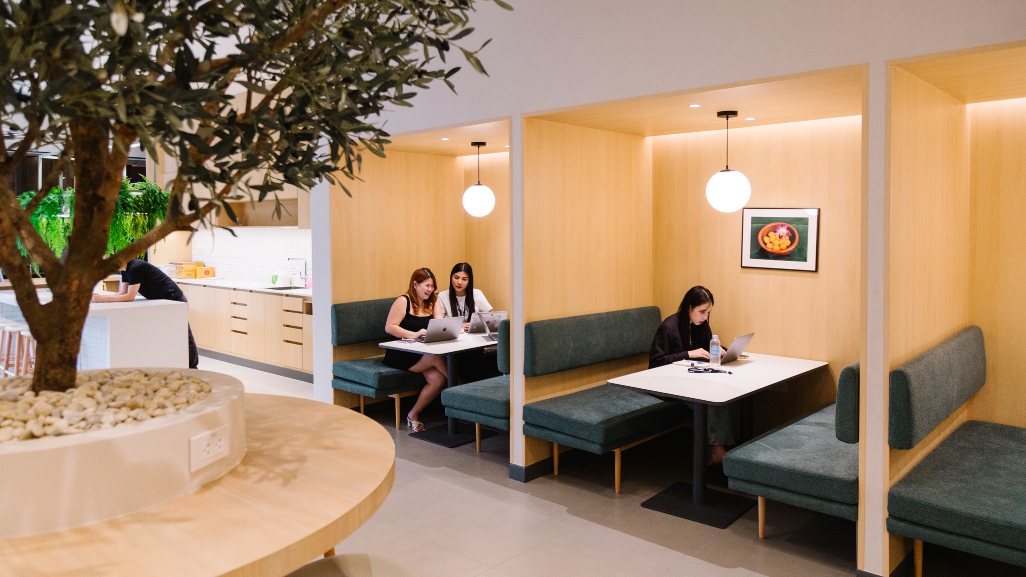 - Green decor above the seating areas offers a calming visual break, promoting wellness.