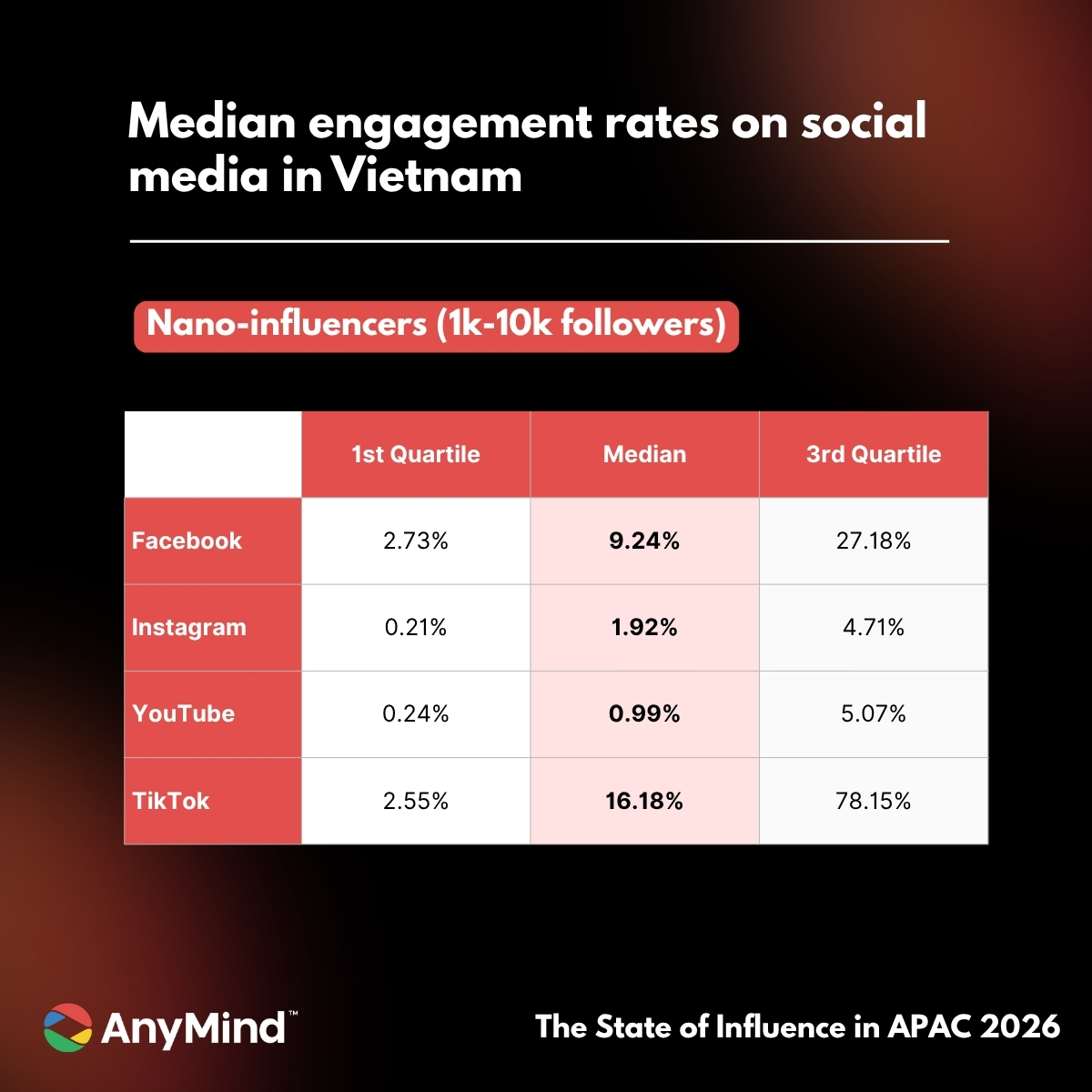 While large influencers still play a role, Vietnam shows particularly strong engagement from nano-influencers (1K–10K followers). On Facebook and TikTok, these creators achieve median engagement rates of 9.24% and 16.18% respectively – far exceeding typical benchmarks in the region.