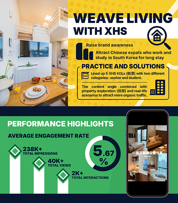 Weave Living is the Asia’s leading lifestyle rental accommodation brand focused on offering high-quality, hassle-free urban living solutions. This year, our primary goal for the campaign with Weave Living was to enhance brand awareness and attract more Chinese individuals working and studying in South Korea to consider their long-stay apartments. Weave Living engaged five XHS KOLs (韩漂), targeting two distinct categories: workers and students. This strategic approach allowed Weave Living to effectively reach different target audiences. The campaign focused on content that combined property exploration (探房) with real-life scenarios, successfully attracting organic traffic related to moving, student housing, and life in South Korea. This approach aligned perfectly with the genuine needs of our target audience looking to rent in South Korea. The campaign achieved impressive results, with a total of over 238K+ impressions, 40K+ views, and 2K+ interactions. Additionally, it recorded an average engagement rate of 5.67% 🔥, showcasing the effectiveness of our outreach efforts.