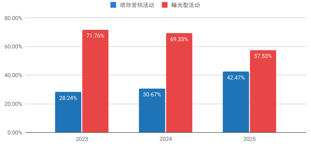 尽管品牌曝光型活动仍占多数,但亚太地区效果驱动型营销活动在过去三年持续增长,效果驱动型活动占比从2023年的28.24%、2024年的30.67%,跃升至2025年的42.47%,增长显著提速。