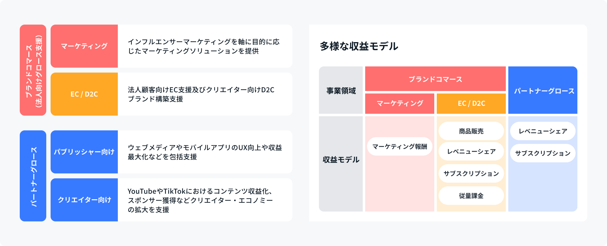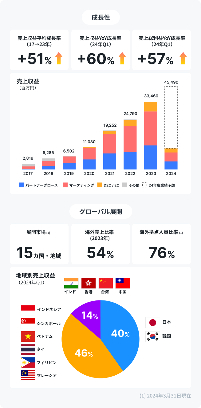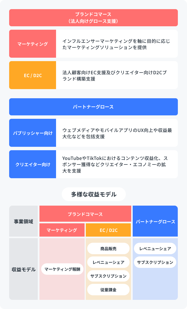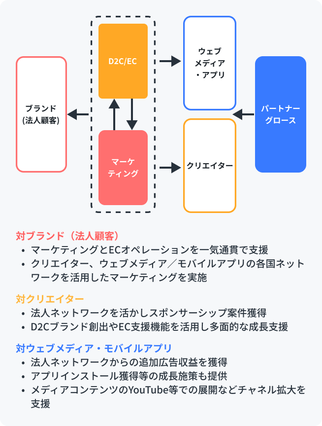 Our company supports clients' business growth and global expansion, primarily across Asia. We operate in two main areas: the "Brand Commerce" segment, which provides e-commerce and marketing support for enterprise clients, and the "Partner Growth" segment, which offers monetization support and UX/Content improvements to help increase revenue for web media operators, app operators, and creators (such as YouTubers and TikTokers).