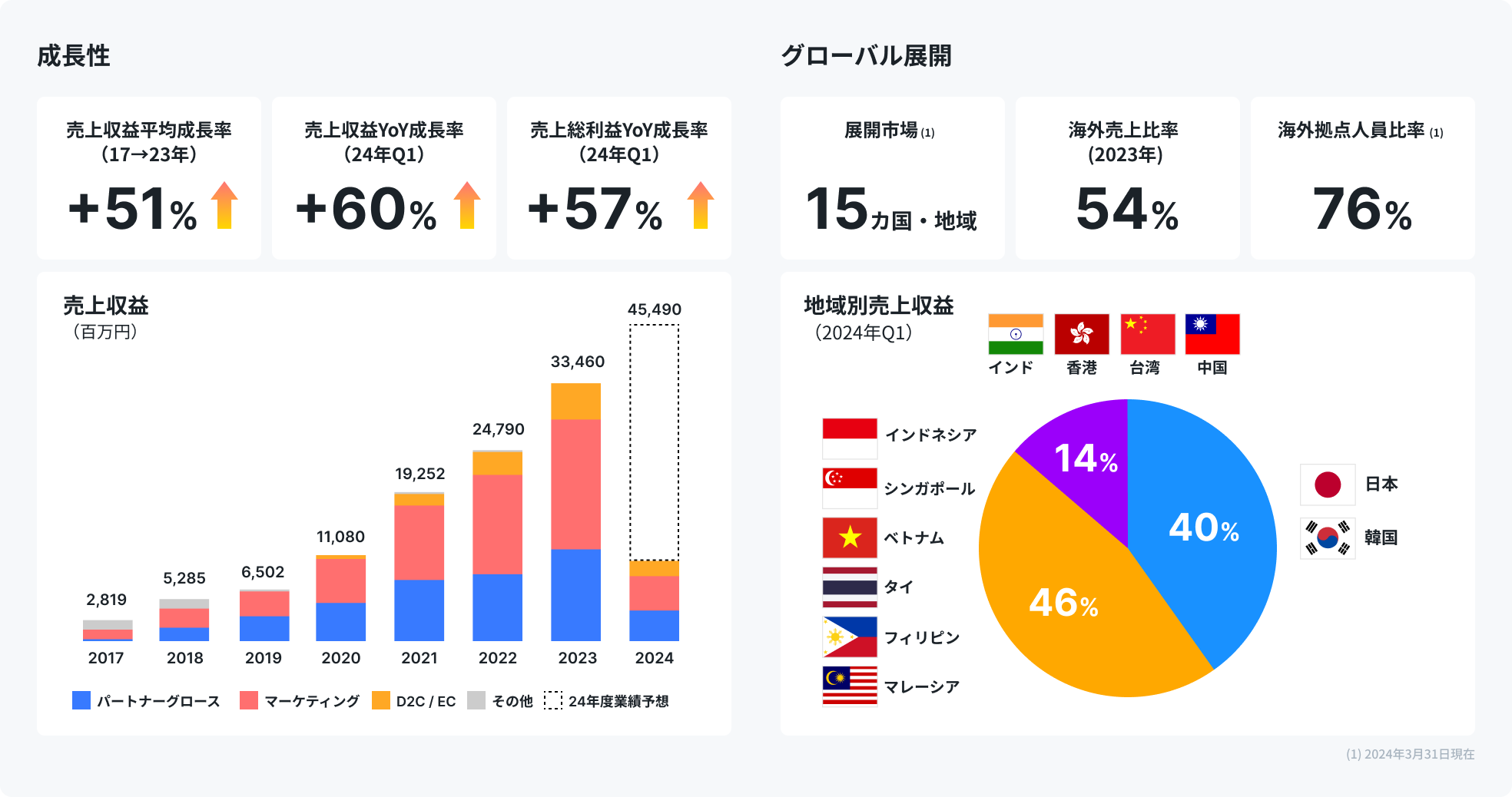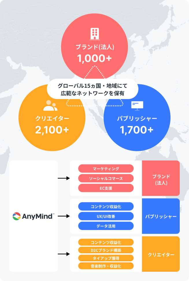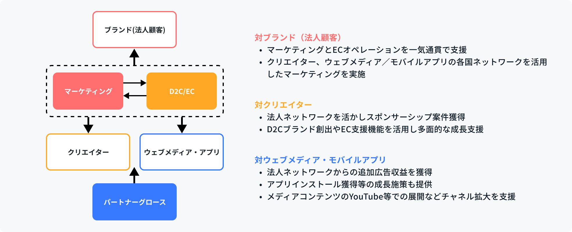 Our company supports clients' business growth and global expansion, primarily across Asia. We operate in two main areas: the "Brand Commerce" segment, which provides e-commerce and marketing support for enterprise clients, and the "Partner Growth" segment, which offers monetization support and UX/Content improvements to help increase revenue for web media operators, app operators, and creators (such as YouTubers and TikTokers).
