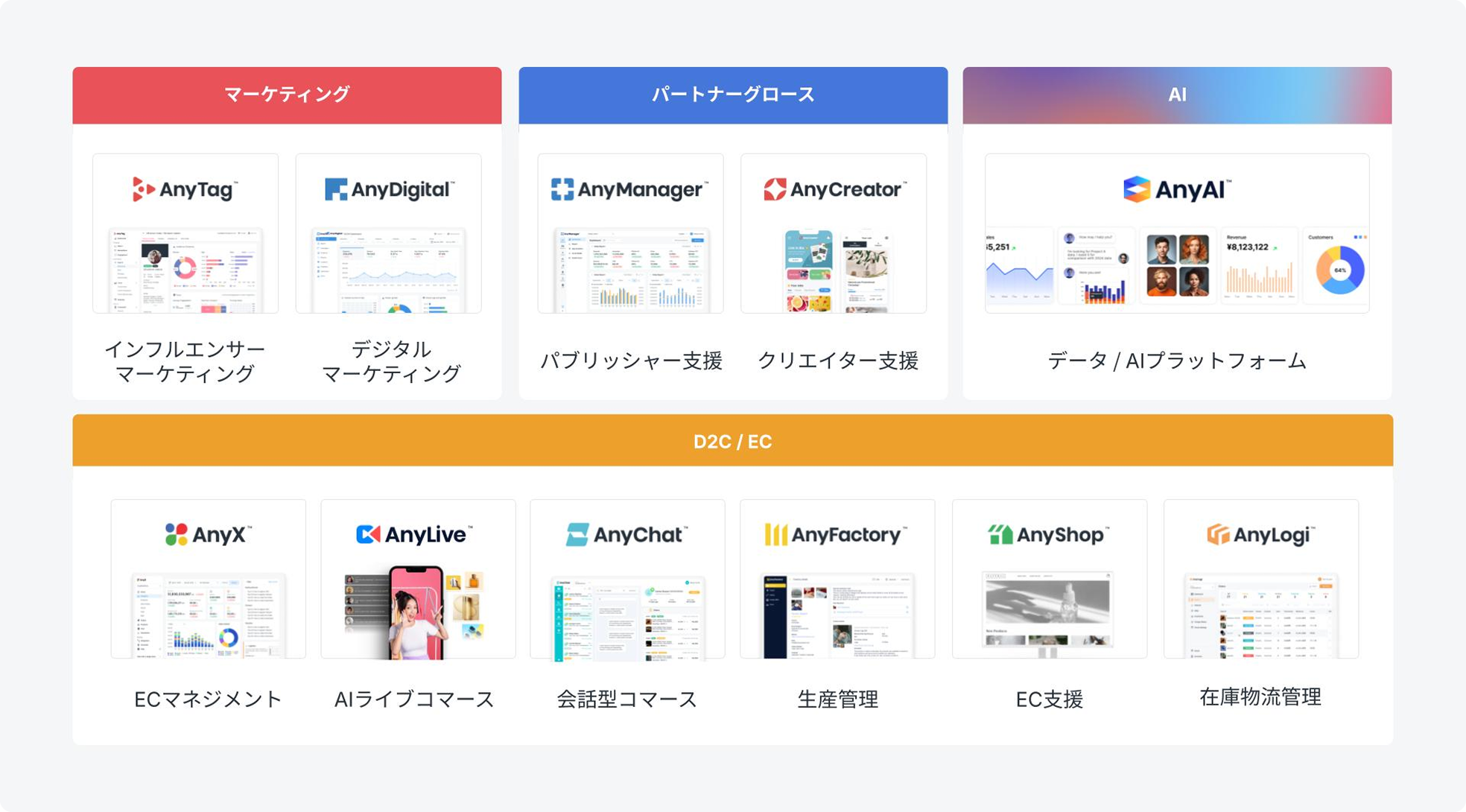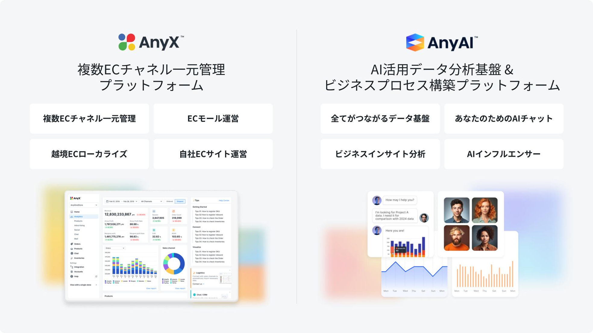 Our company provides "AnyX" an e-commerce management platform that centralizes sales activities across multiple online marketplaces.Furthermore, since 2023, we have been advancing our research and development in AI/LLMs, promoting their implementation into our products and their commercialization. As a result of these efforts, we have developed "AnyAI" an AI-driven integrated data analysis platform. AnyAI is a platform that leverages a client's own data to enable the creation of advanced business processes through AI.