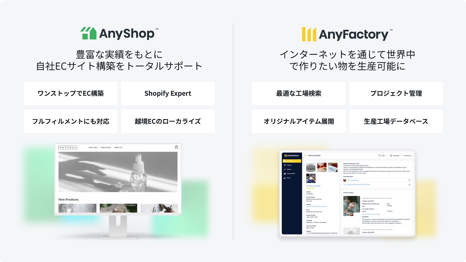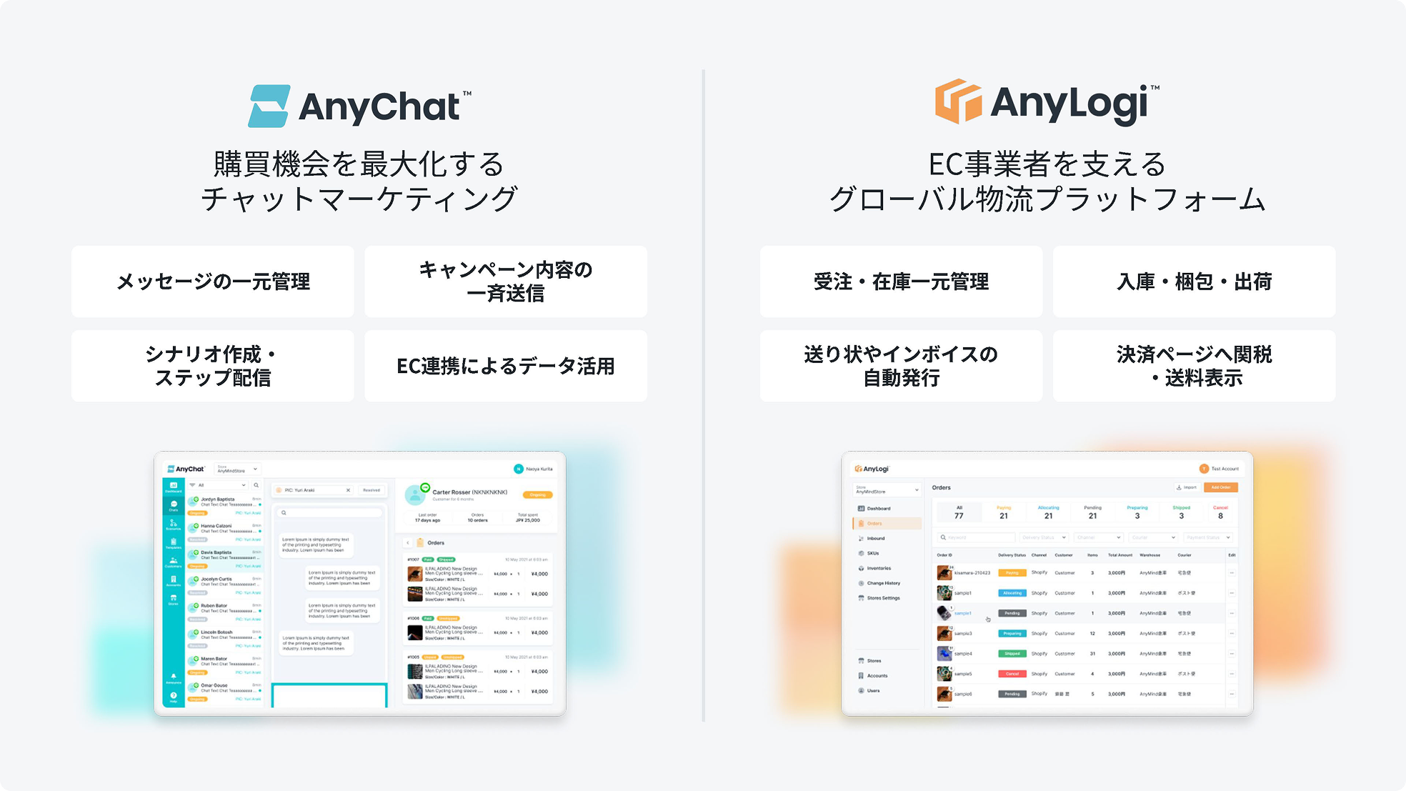 We develop and provide services for building and managing our clients' own e-commerce sites, alongside our conversational commerce platform "AnyChat" and global logistics platform "AnyLogi" Through comprehensive support covering areas such as customer support, logistics, and marketing, we maximize our clients' sales growth.