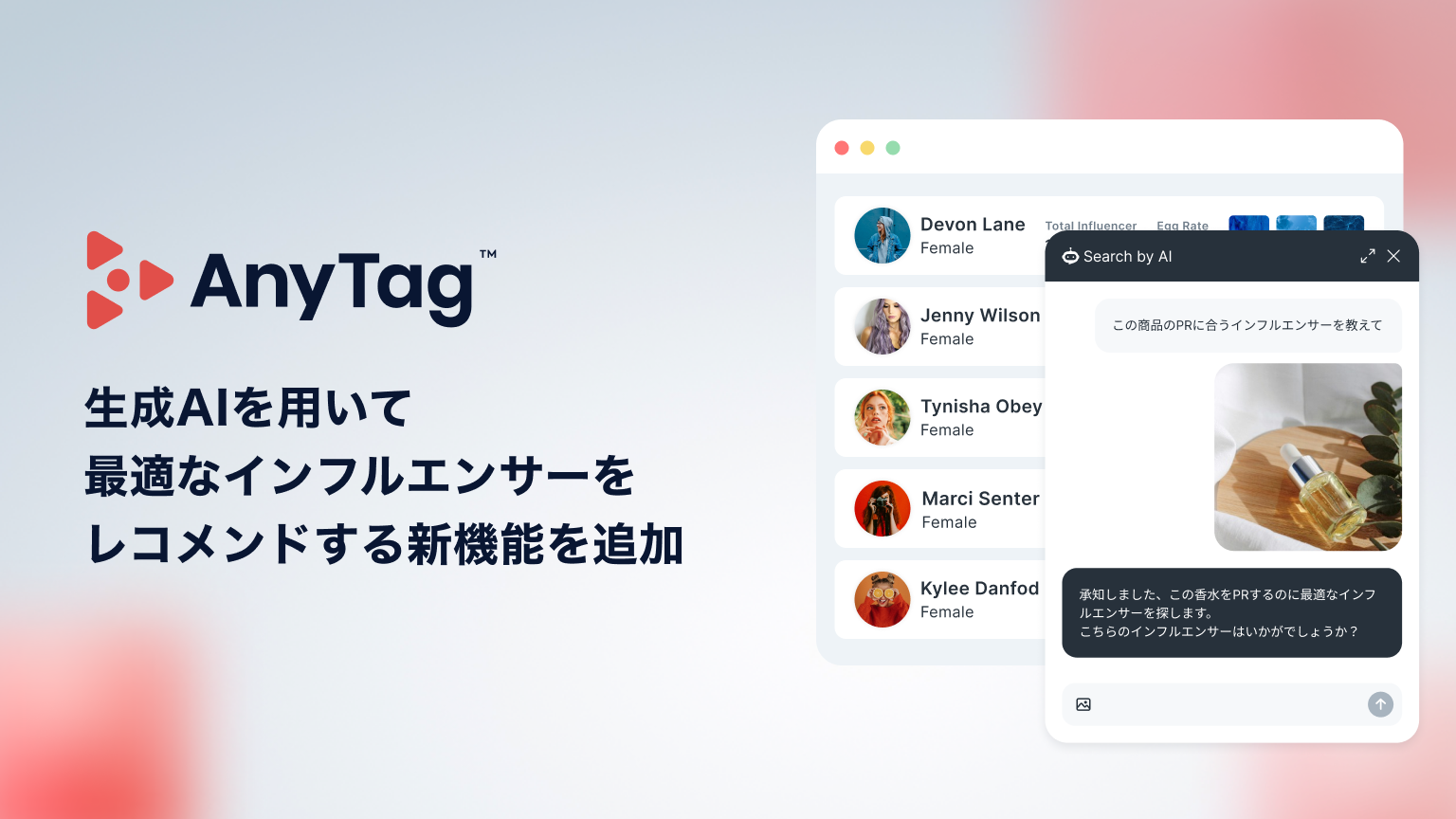 インフルエンサーマーケティングプラットフォーム「AnyTag」、生成AIで投稿画像やキャンペーン情報から最適なインフルエンサーをレコメンドする新機能を提供開始<新たなAIネイティブプロダクト、AIエージェントの開発>