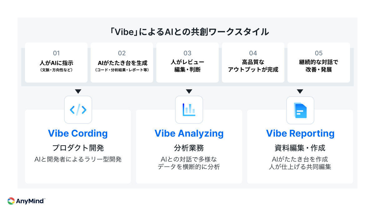 これは、従来のように仕様書に従って一行一行コードを書くのではなく、開発者がAIに自然言語で「こんな体験を実現したい」「こういう見た目にしたい」と伝えることで、AIがコードのたたき台を生成し、それに人間がフィードバックを返すという、共創的な開発手法です。AnyMindでは、このVibe Codingのアプローチをいち早く取り入れ、AIと人が対話しながら開発を進める「ラリー型のプロダクト開発」を実践しています。さらに私たちは、この「Vibe」というアプローチを開発領域だけにとどめず、データ分析や資料作成など他の業務領域にも応用し、AIとの共創による新しいアプローチを広げています。