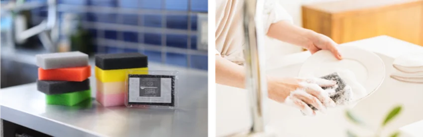 ダイニチ・コーポレーションは創業から、食器洗い用固形洗剤の製造販売を行っています。製造から販売を行う中で、固形洗剤と相性の良いスポンジを研究し、高品質ポリウレタンを使用した、従来のスポンジの概念を覆す「サンサンスポンジ」が生まれました。半年以上使えるほど丈夫で長持ちなので、ごみの削減になります。