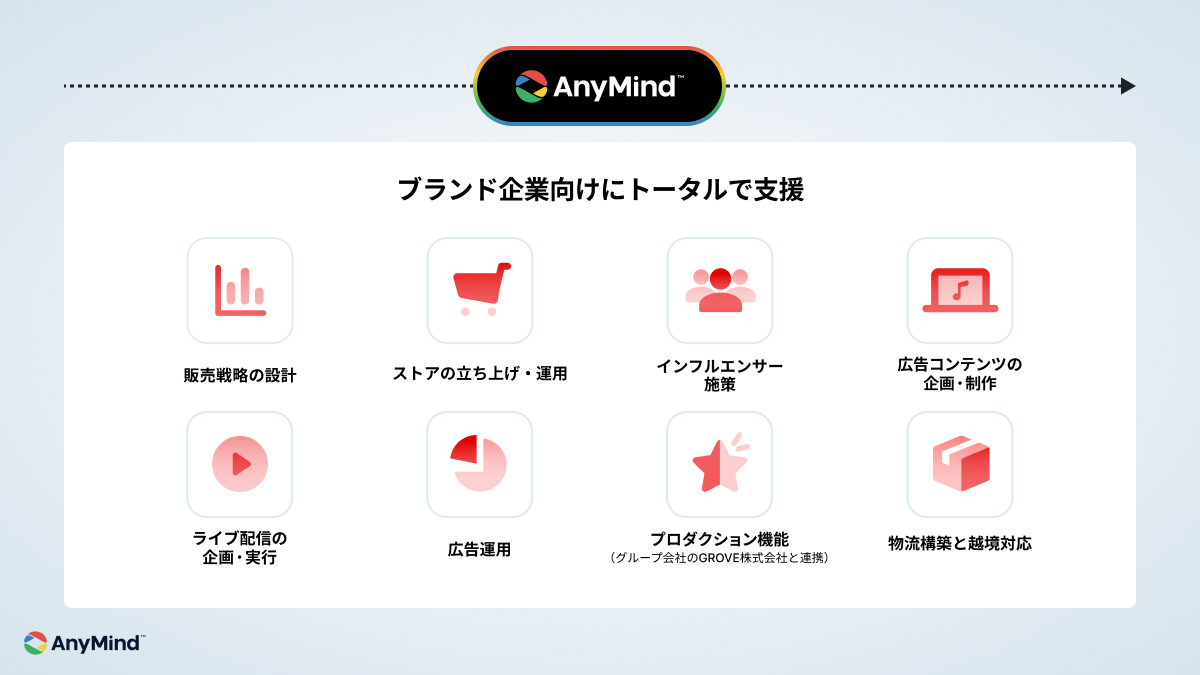 当社の東南アジア拠点での豊富なTikTok Shop支援実績を活かし、日本市場をターゲットとする国内外のブランド企業向けに「TikTok Shop」の導入・運用に関する包括支援サービスを開始します。AnyTag、AnyX、AnyLogi、AnyLiveなどの自社開発プラットフォームを活用することで、戦略設計・ストア構築から運用、物流、ライブ配信までを一気通貫かつデータドリブンに支援し、施策の最適化と成果創出を実現します。