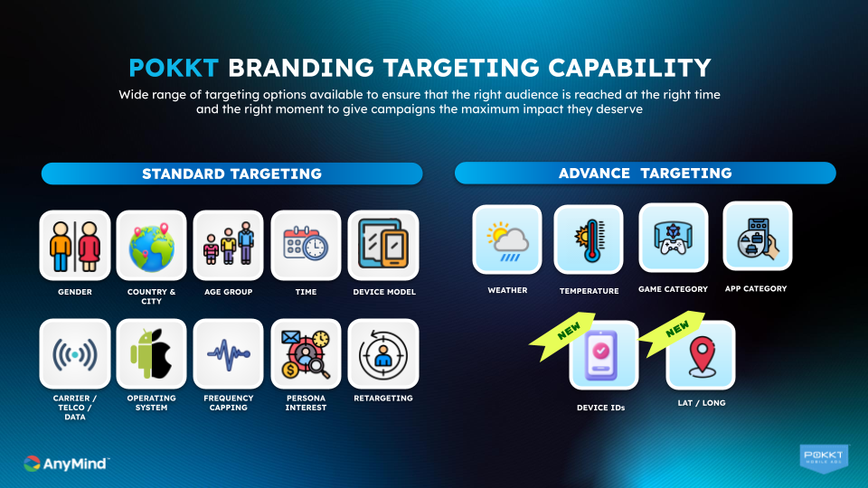 POKKT Branding เหมาะมากสำหรับการเปิดตัวแบรนด์และสร้างการจดจำในระยะยาว ด้วยรูปแบบโฆษณาที่หลากหลาย ทั้งแบบเต็มหน้าจอ วิดีโอที่มีรางวัล ลูกเล่น AR และโฆษณาแบบอินเทอร์แอกทีฟ พร้อมเลือกกลุ่มเป้าหมายได้ตามเพศ ความสนใจ และพฤติกรรม ทำให้เข้าถึงผู้บริโภคได้ตรงจุดและน่าสนใจยิ่งขึ้น
