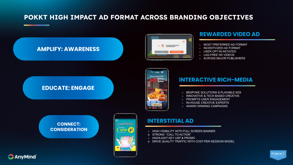 - ขยายฐานผู้ชม – ใช้ Inventory จากแอปมือถือของ POKKT เพื่อเข้าถึงกลุ่มเป้าหมายใหม่ในประเทศไทย ที่ไม่เคยมีปฏิสัมพันธ์กับแบรนด์มาก่อน