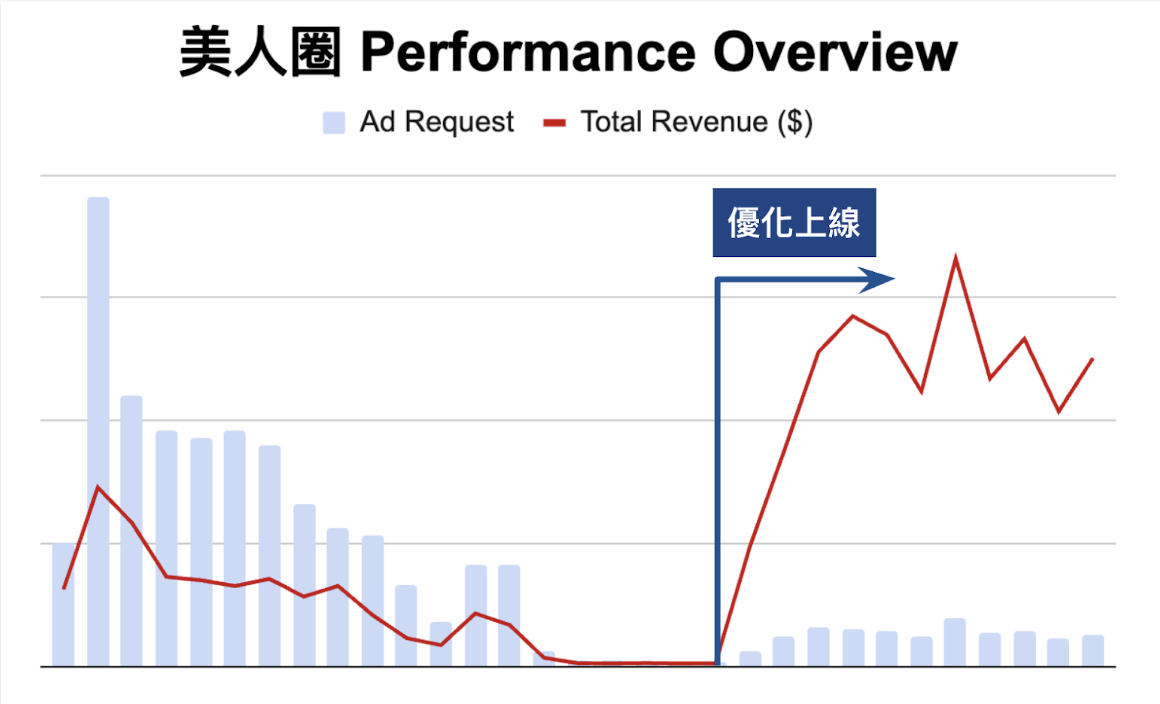 隨著時間推移,因 Google 程式化廣告對 passback 機制的調整,導致廣告請求與效能出現波動。美人圈積極評估資源運用策略,並期待與第三方合作夥伴攜手,有效優化剩餘流量與廣告請求、增加收益來源。